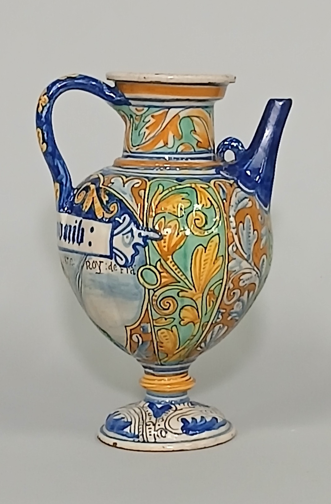 MONTPELLIER - Chevrette en majolique de la série des rois de France, à décor polychrome a quartieri de rinceaux feuillagés dans des compartiments à fond orangé et vert alternés, sous l'anse l'inscription pharmaceutique s ; de limonib : dans un bande