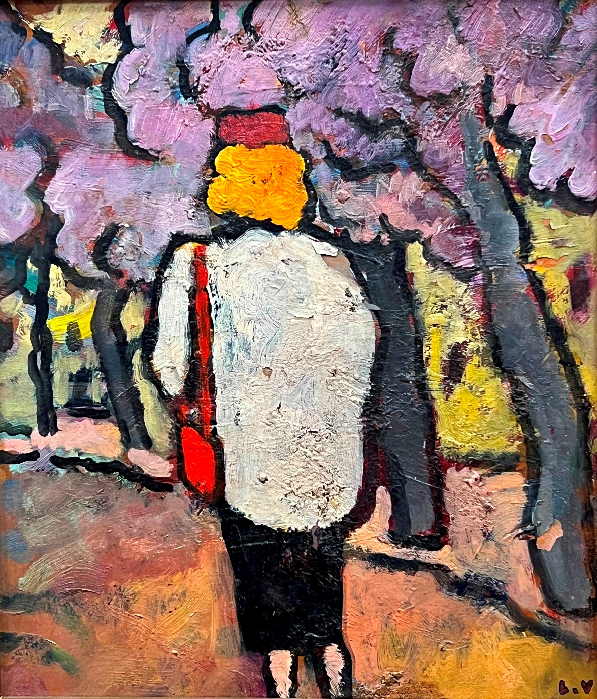47 - Louis VALTAT (1869-1952) "Jeune femme se promenant au bois" 1933 Huile sur carton marouflé sur toile, porte le cachet des initiales en bas à droite. (éclats visibles) 28 x 25 cm