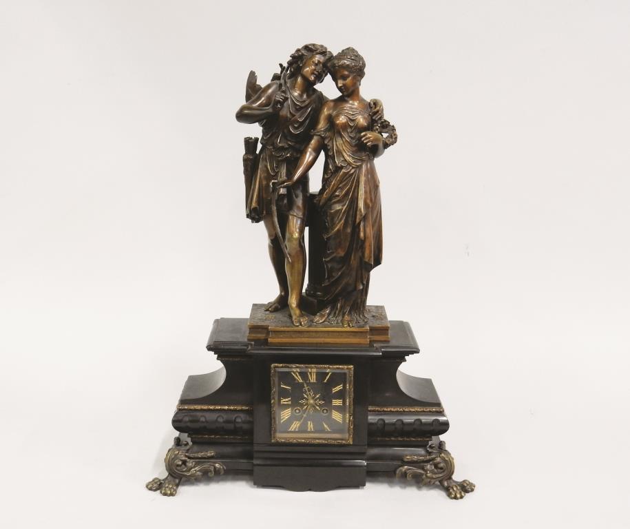 Miroir à pareclose en bois recouvert de cuivre repoussé à décor d'angelots, guirlandes et masques. XIXe siècle. (manque à un angle). 111 x 71 cm
