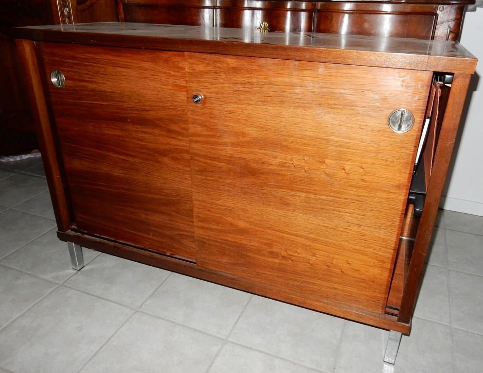 TRAVAIL FRANCAIS vers 1960 - Meuble à dossiers en placage de palissandre ouvrant à deux portes coulissantes découvrant d'un côté des portes-dossiers et de l'autre une étagère. Repose sur un piètement en acier chromé. H. 85,5 L. 120 P. 44,5