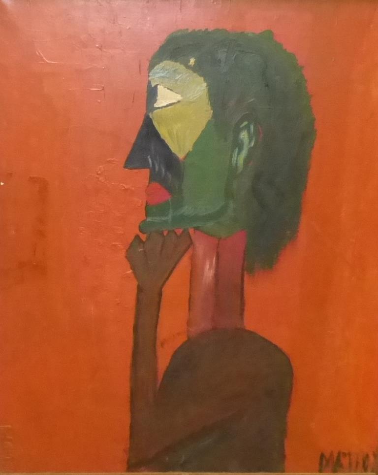 MATIOT, Ecole FRANCAISE du XXe siècle "Homme de profil sur fond rouge" Huile sur toile, signée en bas à droite. 81 x 65 cm
