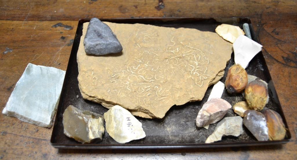 Carton contenant : pierres taillées, tesson de céramiques et bois fossilisé.