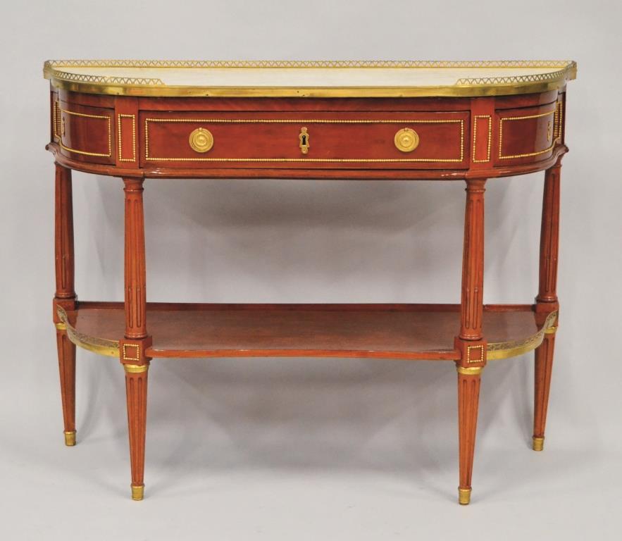 Bureau plat en acajou et filets de laiton ouvrant à deux tiroirs en ceinture. Il repose sur des pieds fuselés et cannelés. Style Louis XVI H. 79 L. 110 P. 60 cm