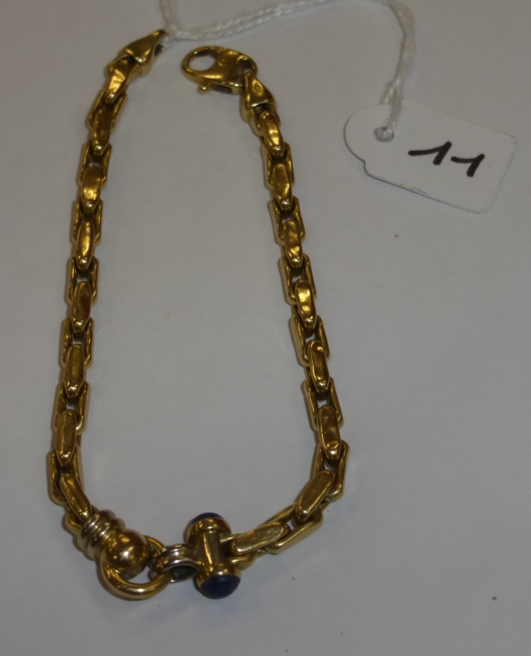 Bracelet en or jaune 18k, à mailles vénitiennes, orné en son centre d'une articulation sertie de cabochons de lapis lazuli. PB : 11,7 gr