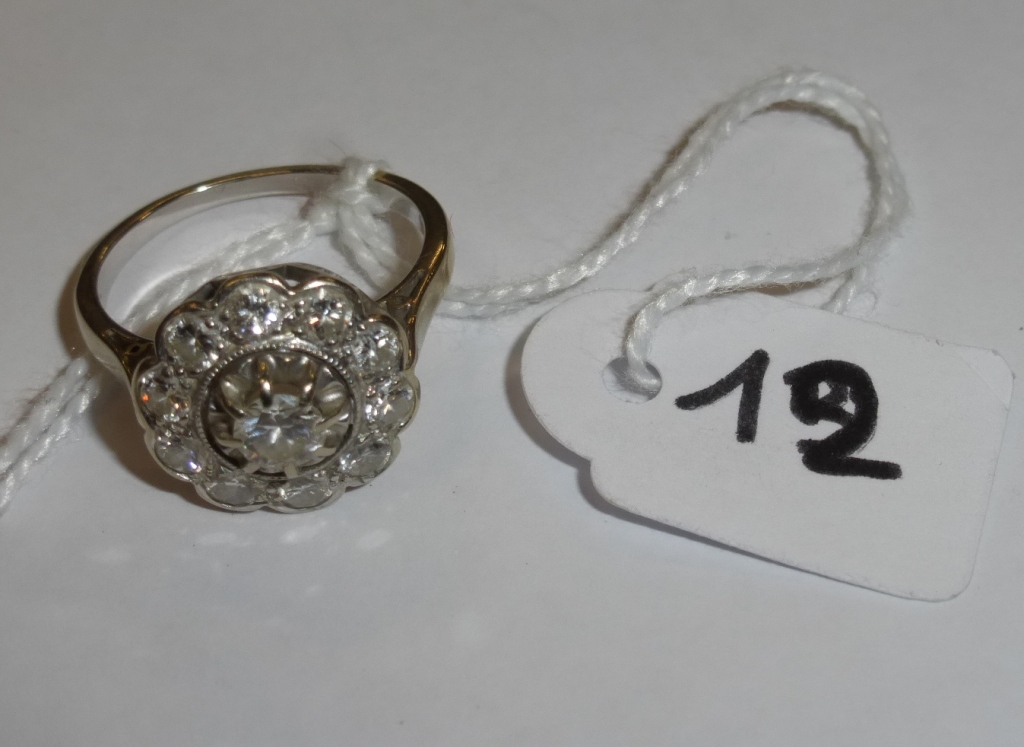 Bague marguerite en or gris, ornée en son centre d'un diamant taille brillant de 0,4 mm (un choc), entouré de 10 petits diamants. TDD : 50,5 mm - Poids : 9,3 gr
