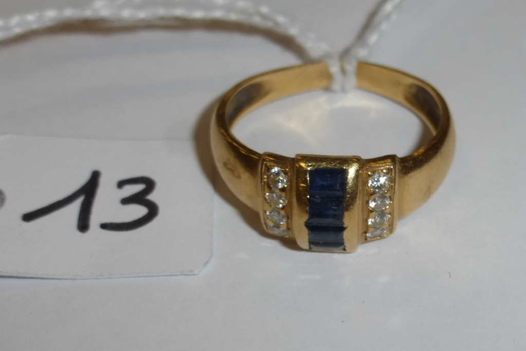 Bague en or jaune ornée en son centre de quatre saphirs taille baguette sertis clos, entourés de deux rangées de cinq petits diamants (anneau légèrement déformé). TDD : 53 cm - PB : 3,5 gr