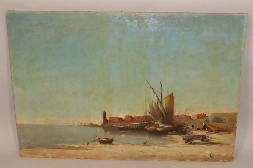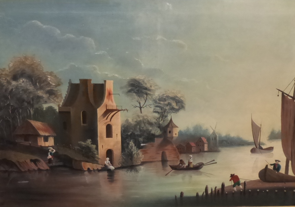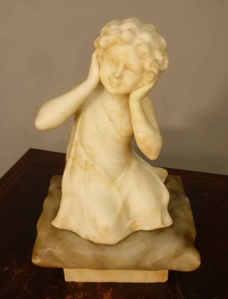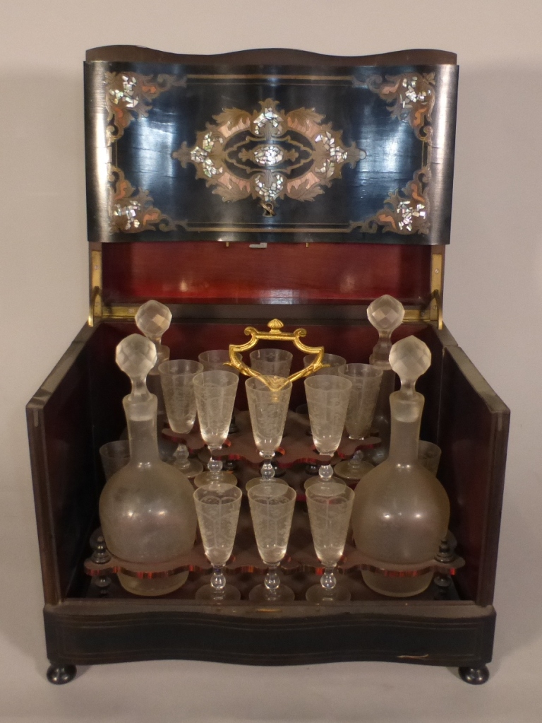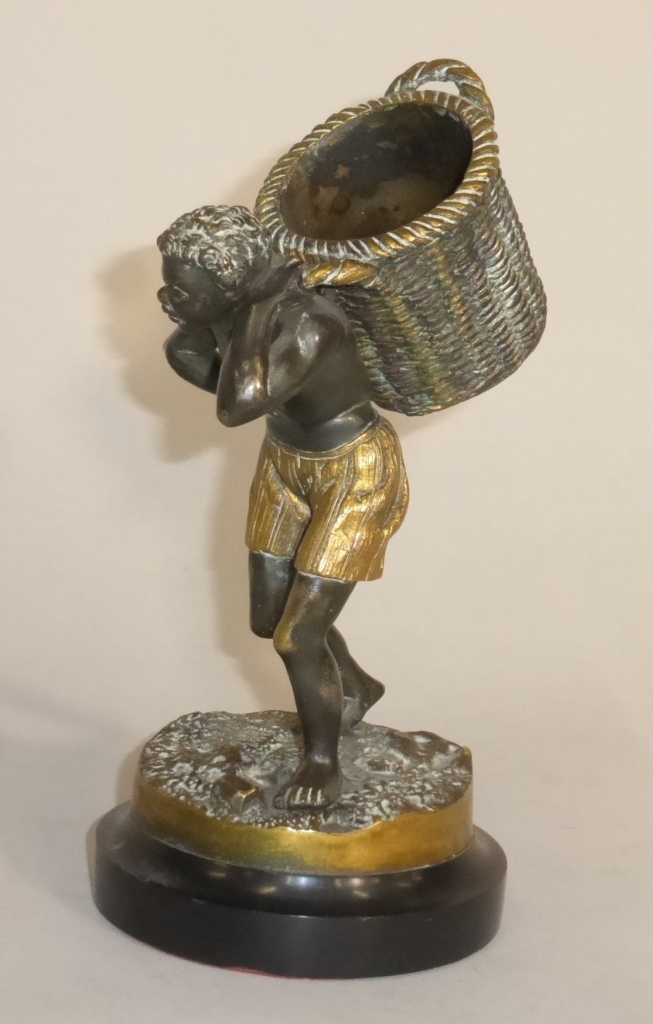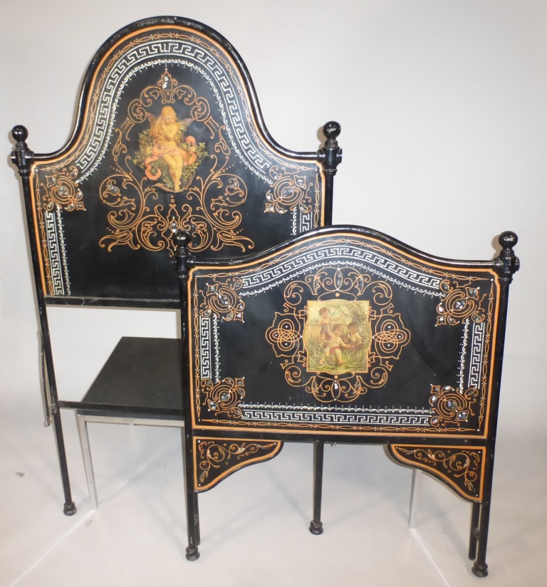 Lit une place enfant en métal laqué noir à décor de rinceaux incrustés de nacre et frises de grecque, ornés de nymphette et enfants pêchant. Epoque Napoléon III. H.161 L. 190 P. 90 cm