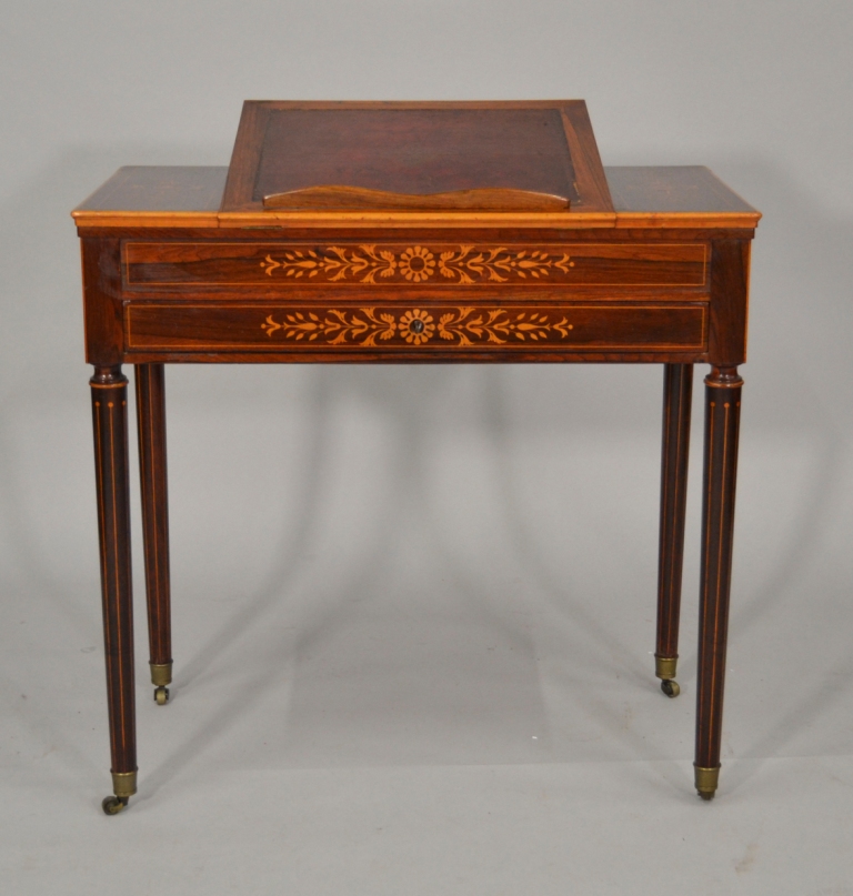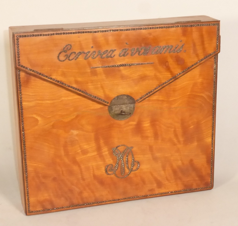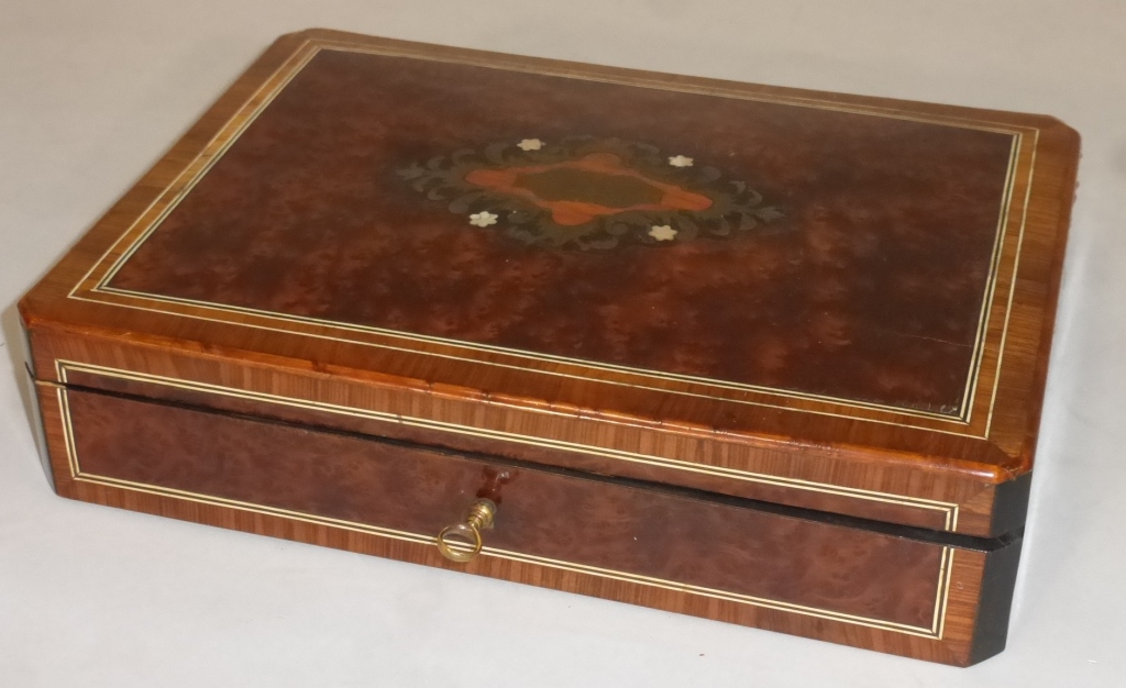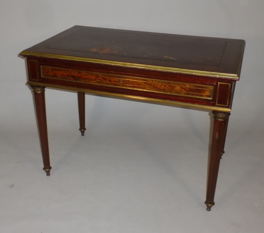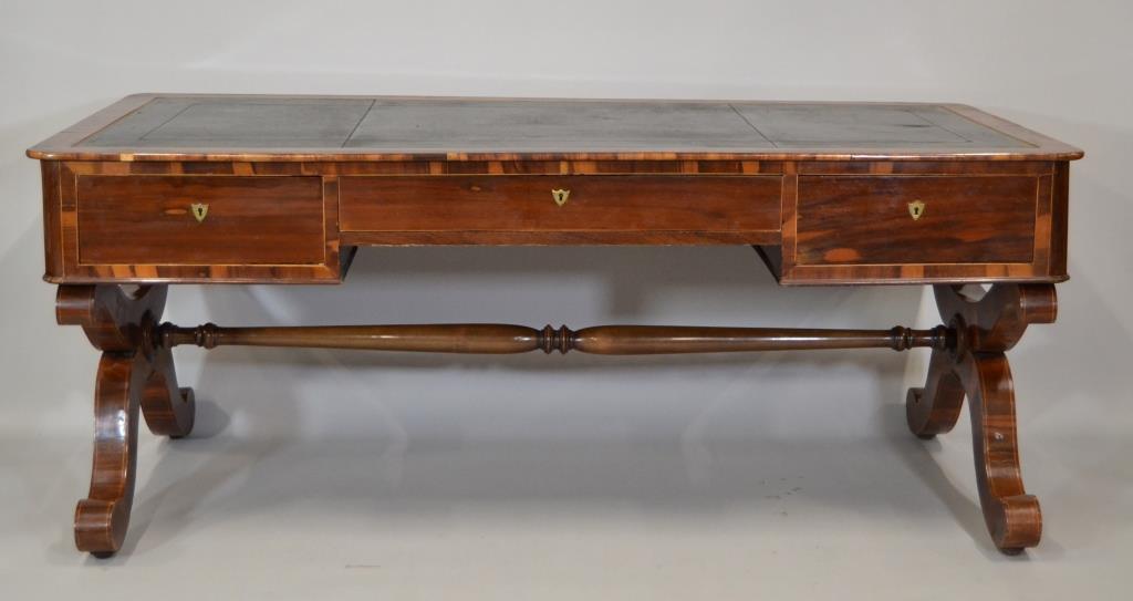 Grand bureau rectangulaire en bois de placage et filets de bois clair. Plateau en cuir noir doré aux petits fers. Il ouvre à trois tiroirs en ceinture. Il repose sur deux pieds en X réunis par une entretoise. Epoque Restauration (restaurations)