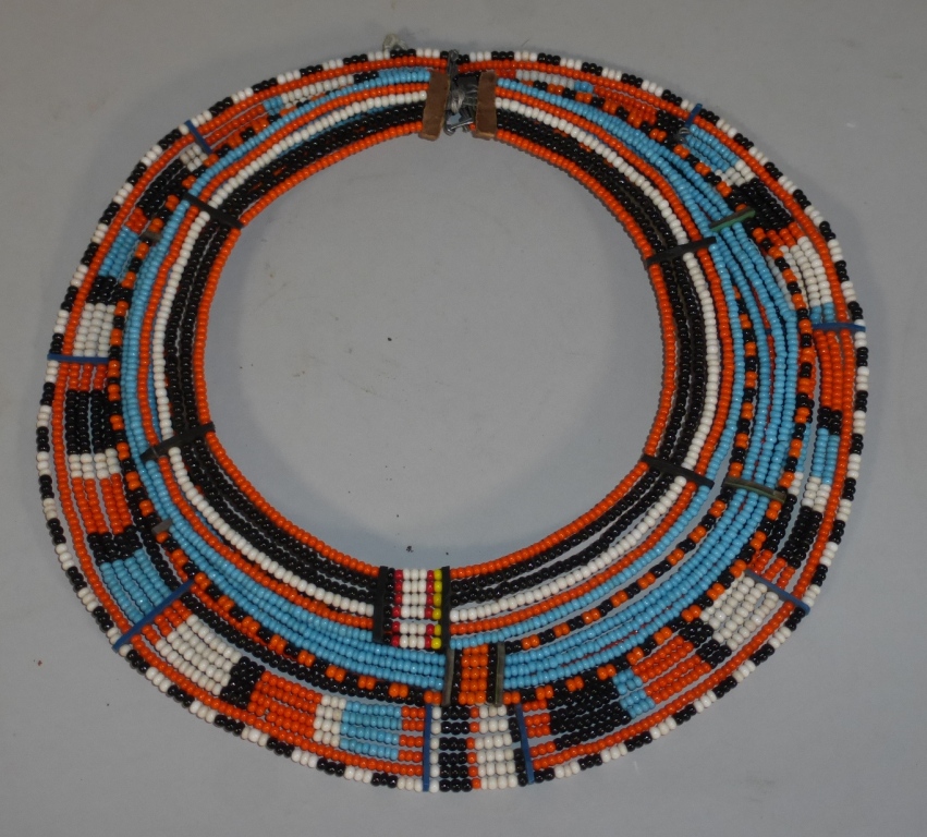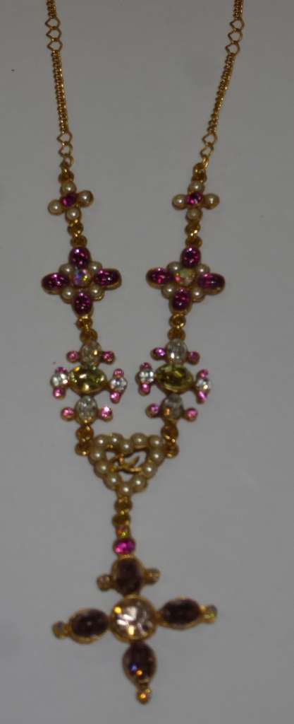 Christian LACROIX - Collier fantaisie en métal doré à décor de pierres de couleurs et perles fantaisie, signé.