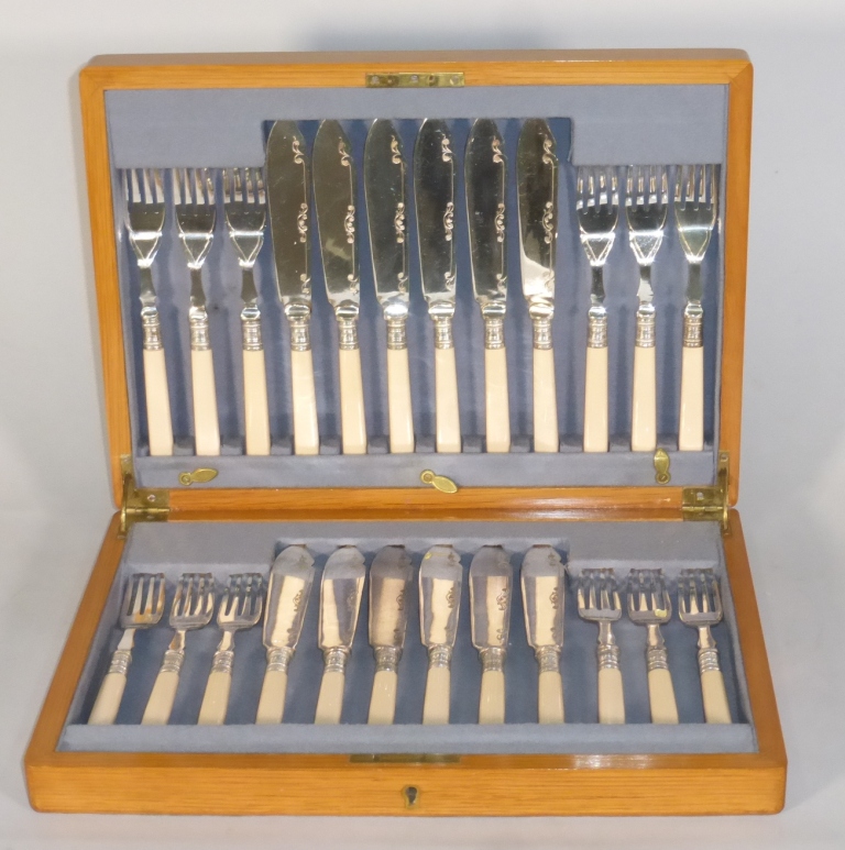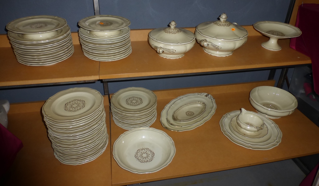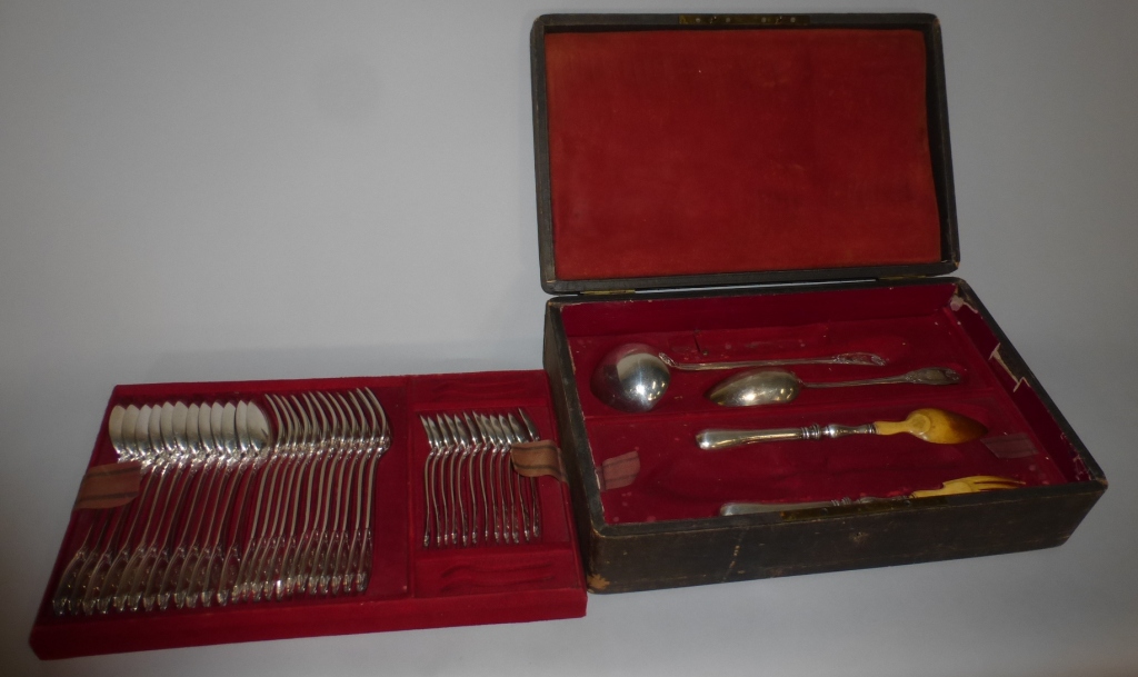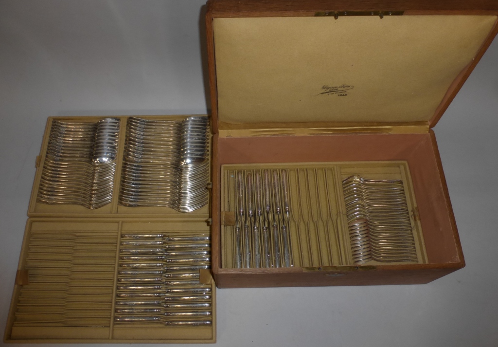 Ménagère en argent modèle filets coquille chiffré "FD" comprenant douze couverts, douze petites cuillers et quatre pièces de forme. Poinçon Minerve. Epoque Napoléon III. (Dans un écrin à deux compartiments). Poids: 3 000 gr