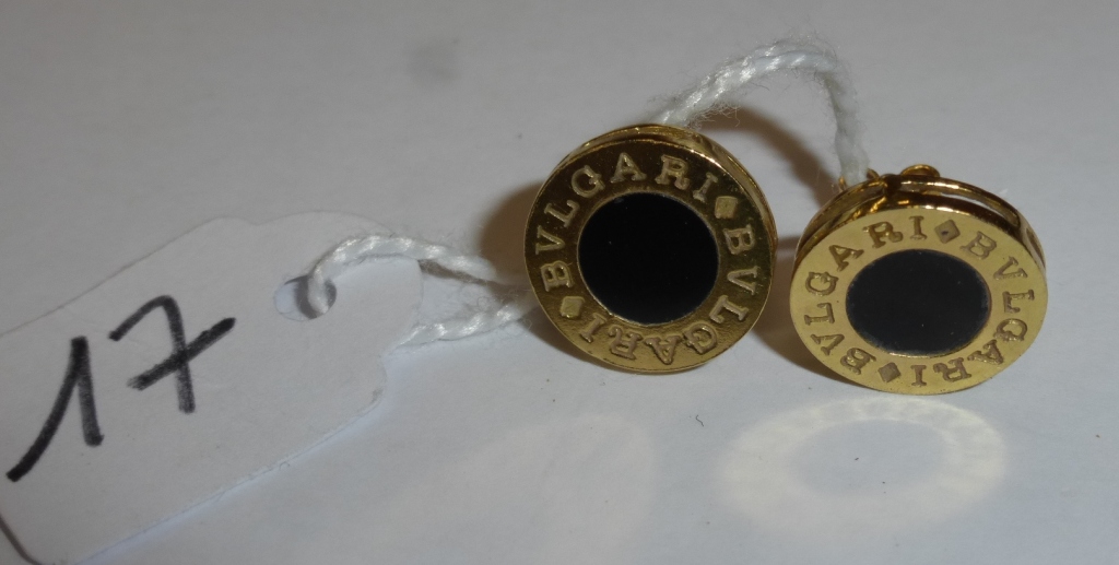 BULGARI - Paire de boucles d'oreilles en or jaune gravé Bulgari et onyx en son centre. Poids: 3,2 gr