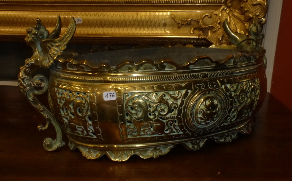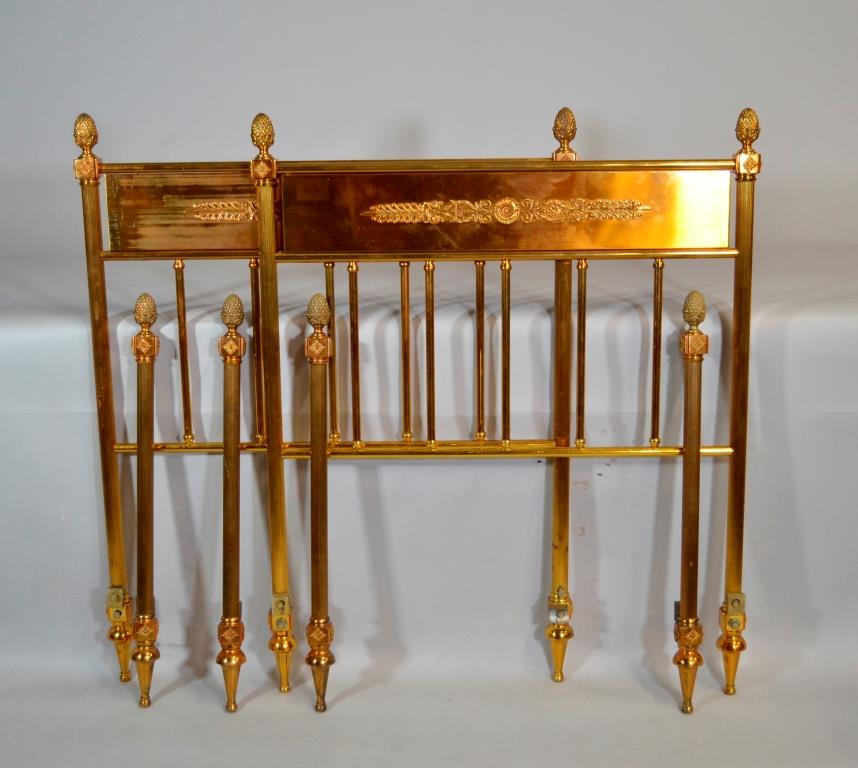 Paire de lits une place en laiton à décor de frises de feuillages, rosace et pommes de pins. Style Restauration. H. 114 L. 190 P. 90 cm