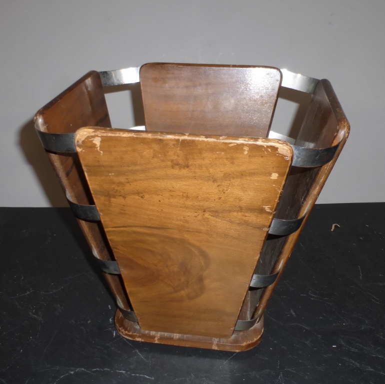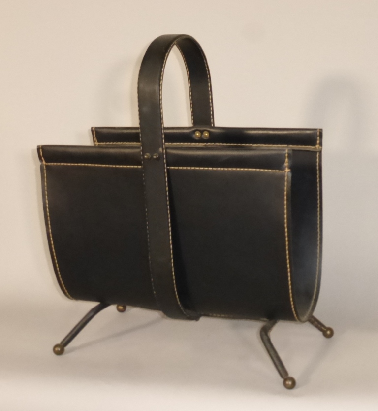 Jacques ADNET (1900-1984) Porte-revues en métal et cuir noir piqué-sellier. Repose sur quatre pieds terminés par des boules de laiton. H. 47 L. 38 P. 18 cm