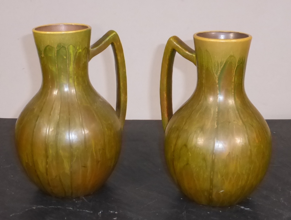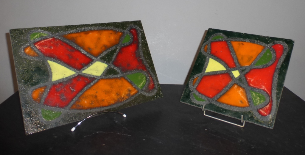 Robert (1930- 2008) et Jean CLOUTIER (1930- 2015) Deux carreaux en céramique à décor abstrait émaillé orange, vert et jaune. 46,5 x 31 cm et 31 x 31 cm