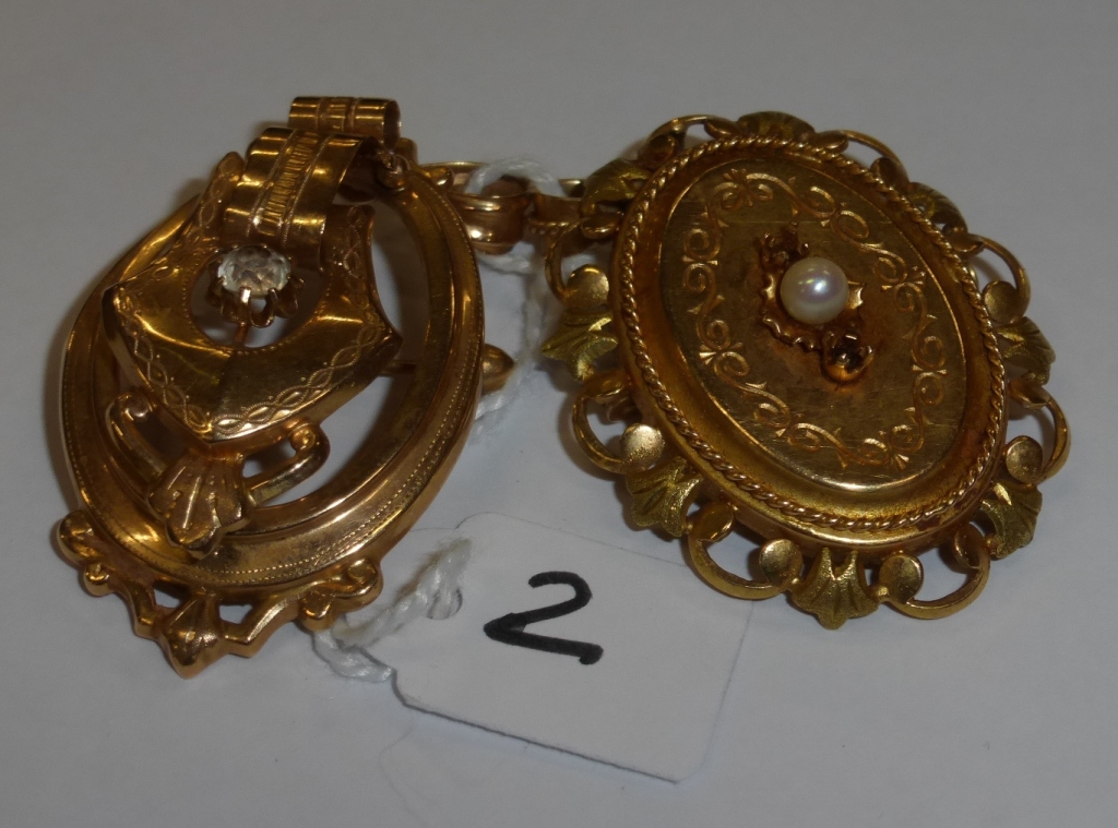 Deux broches ovales en or jaune 18k à décor ajouré de rinceaux, l'une ornée en son centre d'une perle et l'autre ornée d'une pierre blanche. PB: 13 gr