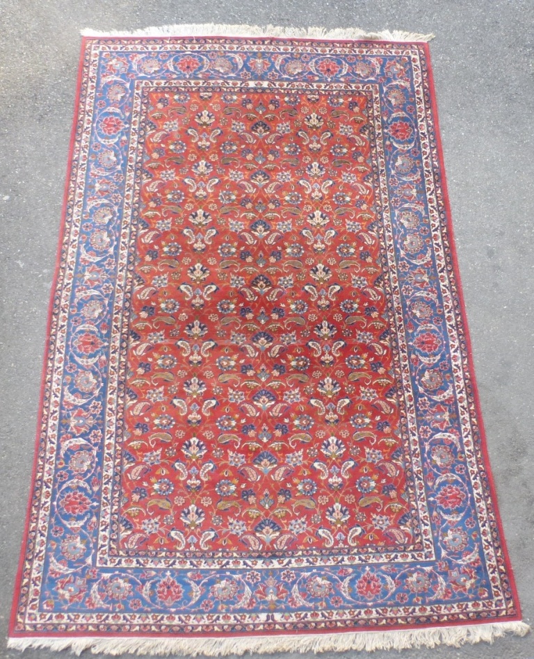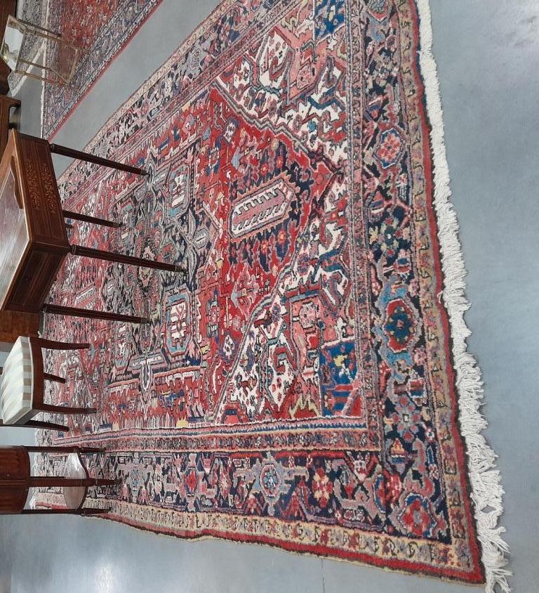Tapis en laine à décor géométrique sur fond rouge. Bordure à fond bleu. 340 x 240 cm