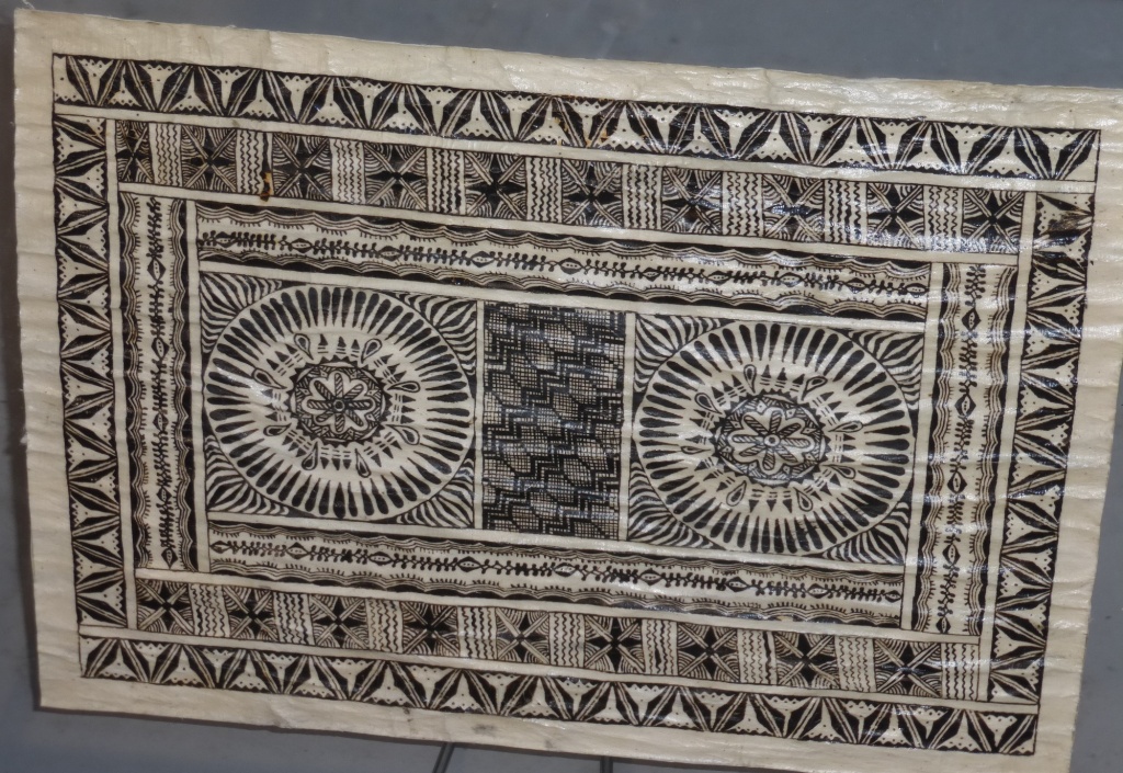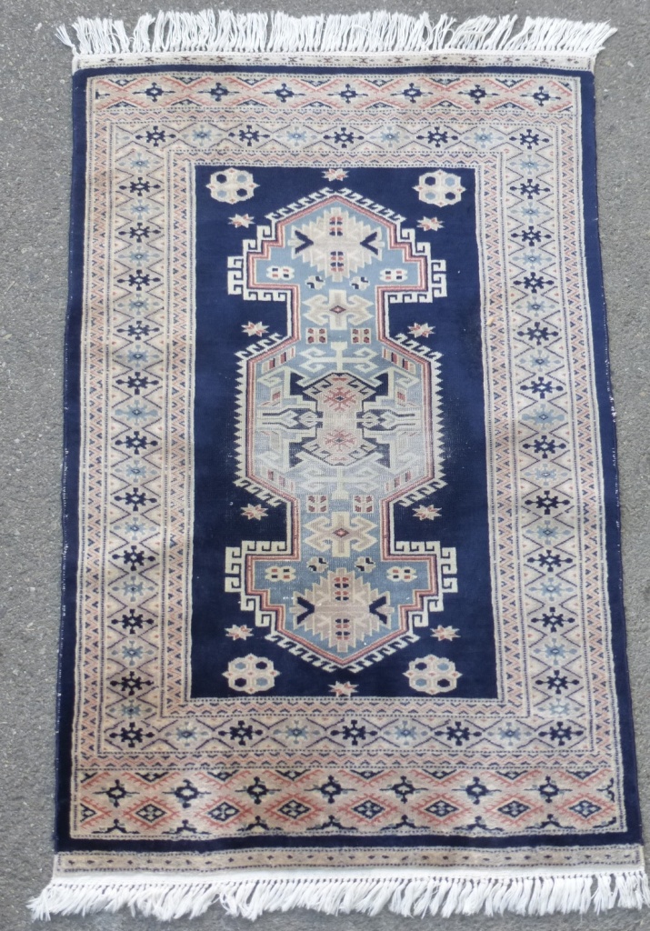 Tapis en laine à décor géométrique crème sur fond bleu. Bordure crème. 125 x 83 cm