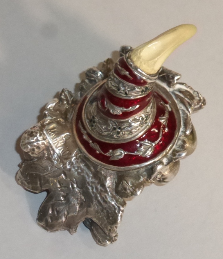 MAGRINO Alessandro - Presse-papiers en forme de corne d'abondance en argent, émail rouge et ivoire à décor de fruits posés sur une feuille de vigne, signé. Travail étranger. L. 9 cm PB : 71 gr