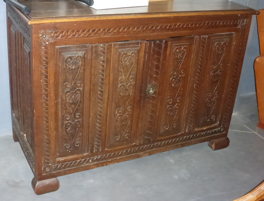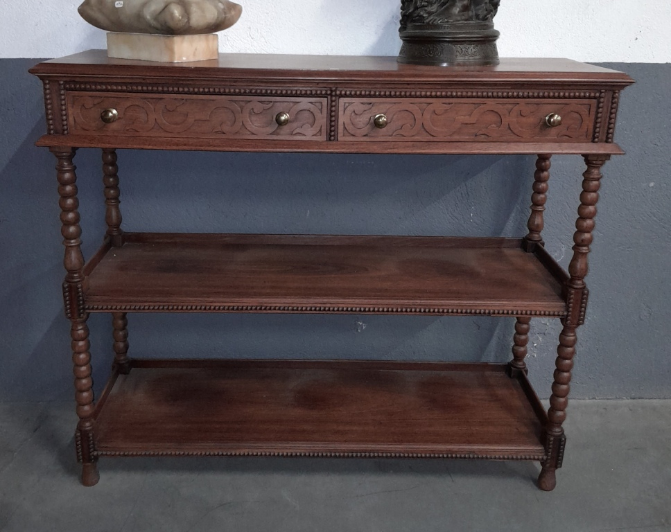 Desserte en bois sculpté ouvrant à deux tiroirs et deux tablettes d'entrejambe. Pieds tournés. Fin XIXe siècle. H. 99 L. 117 P. 37 cm