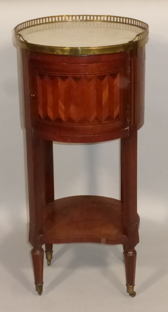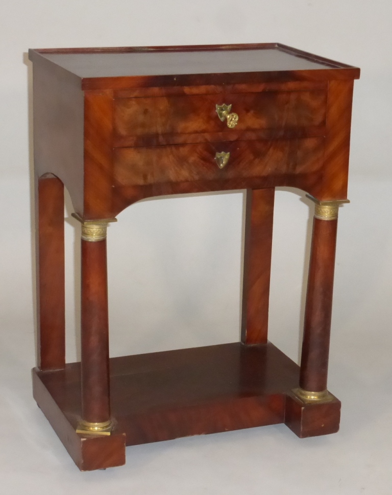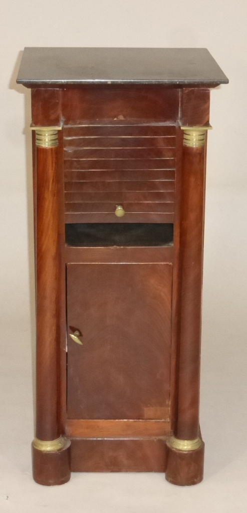 Table de chevet en placage d'acajou ouvrant à un rideau coulissant et une porte. Montants à colonnes détachées ornées de chapiteaux en bronze. Dessus de marbre noir. Epoque Empire (petits accidents). H. 83 L. 38 P. 39 cm