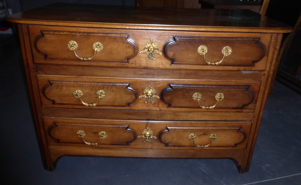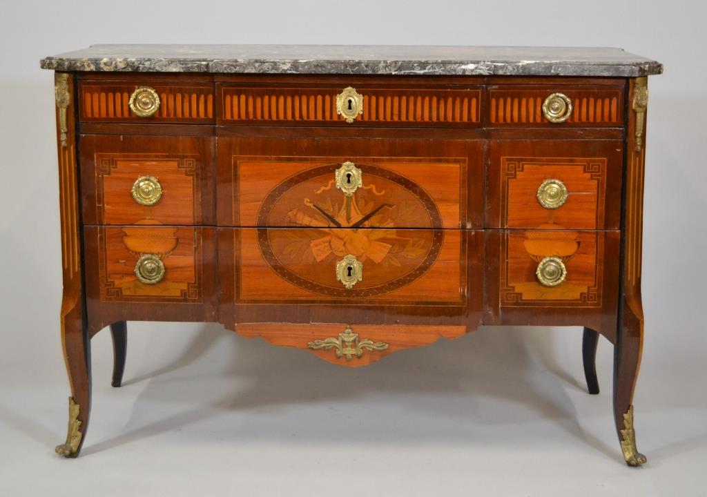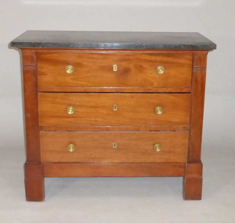 Petite commode en acajou et placage d'acajou ouvrant à trois tiroirs. Repose sur des pieds droits. Dessus de marbre noir. Epoque Empire (petite fente au côté gauche) H. 84 L. 98 P. 49 cm