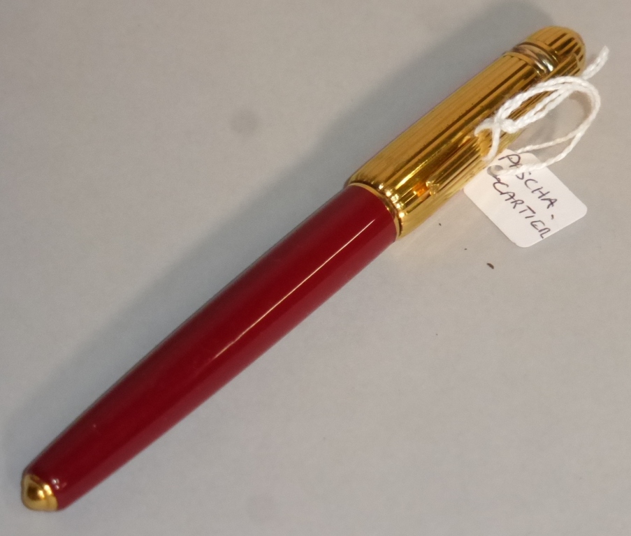 CARTIER - Stylo plume modèle "Pasha" le corps en laque bordeaux, le capuchon plaqué or godronné. Plume en or 18K
