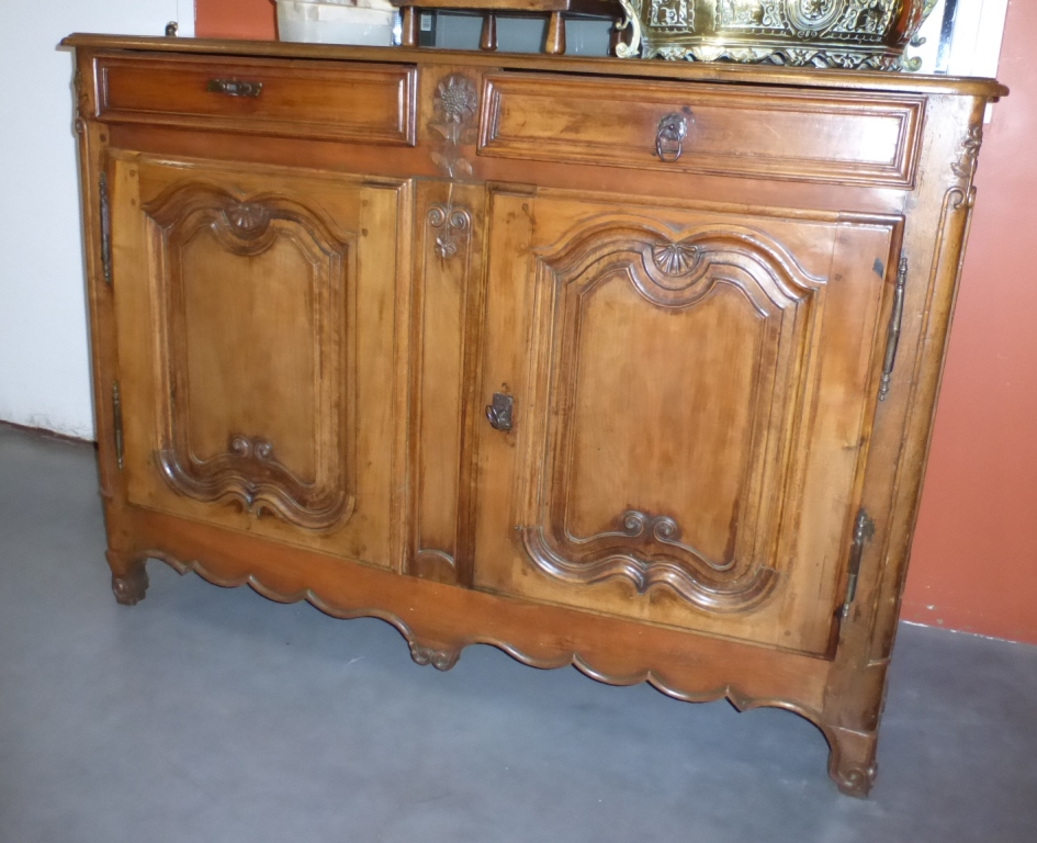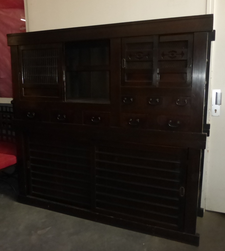 JAPON - Buffet deux corps en bois teinté ouvrant en partie supérieure à deux portes coulissantes et huit tiroirs; et en partie basse à deux grandes portes coulissantes. H. 168 L. 180 P. 50 cm