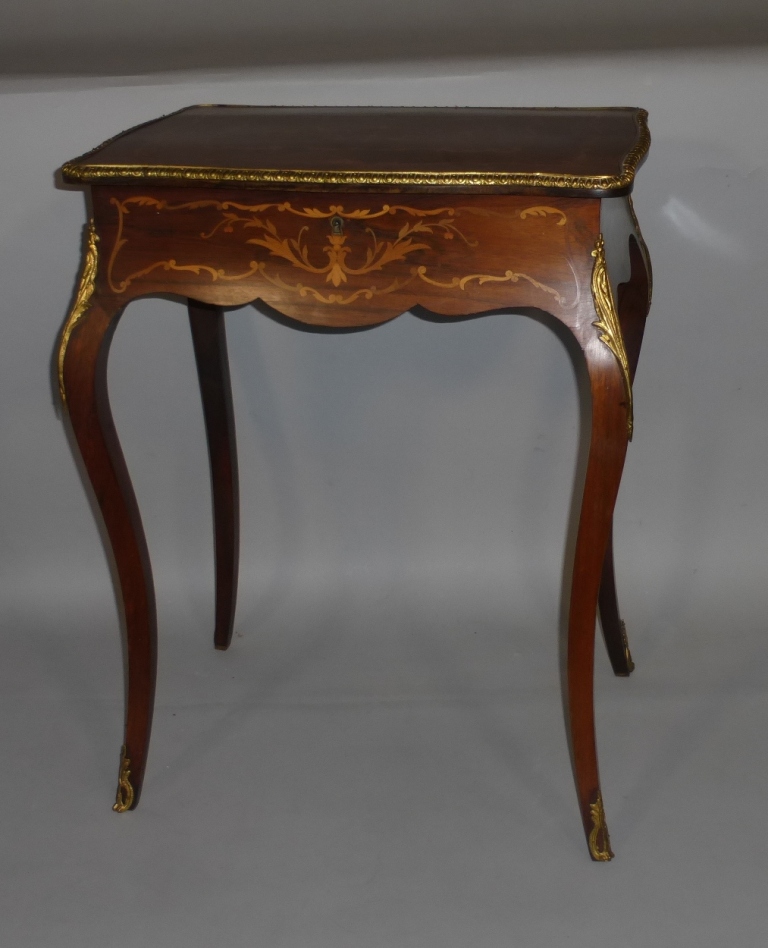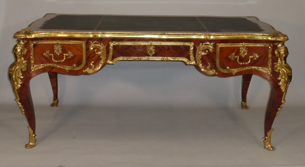 Bureau plat en bois de placage ouvrant à trois tiroirs. Le plateau mouvementé, gainé de cuir noir doré aux petits fers est bordé d'une lingotière en bronze. Riche ornementation de bronzes dorés. Style Louis XV, XXe siècle
