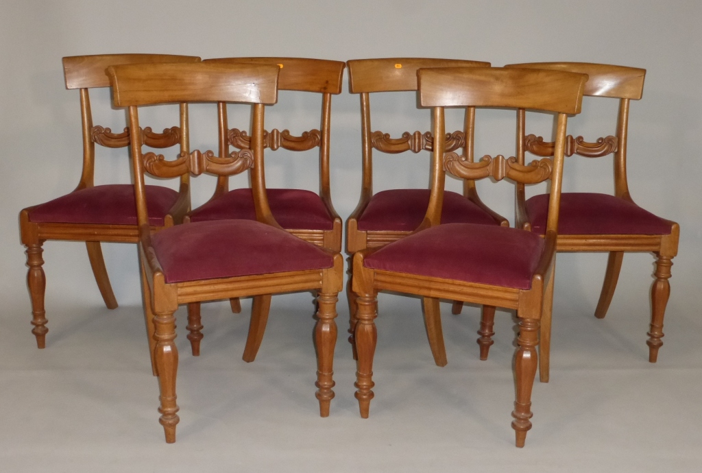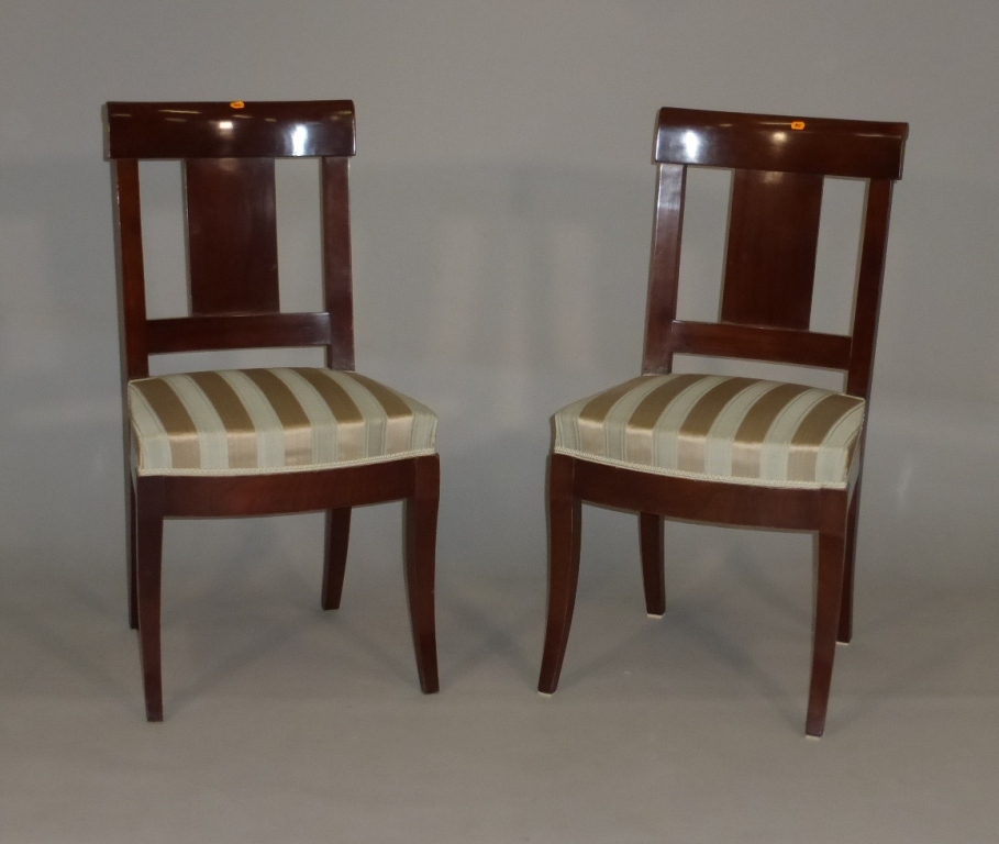 Paire de chaises en acajou recouvertes de tissu rayé. Dossiers ajourés, pieds sabres. (petite restauration à l'une) Epoque Empire. H. 87 cm