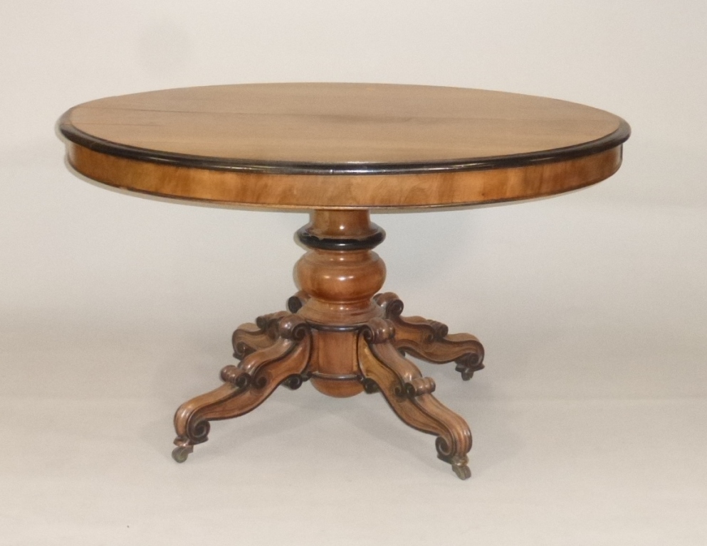 Table de salle à manger à allonges en noyer et bois noirci. Plateau ovale. Repose sur un piétement central terminé par quatre pieds moulurés. Epoque Louis Philippe. H. 72 L. 125 P. 102 cm