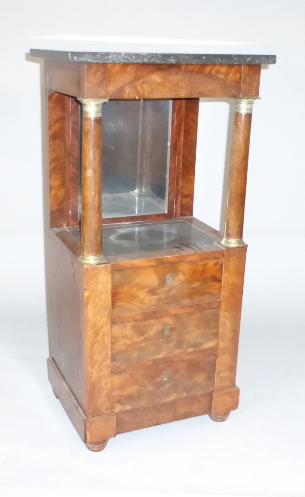 Barbière en placage d'acajou ouvrant à un miroir coulissant, un tiroir latéral, une niche supportée par deux colonnes et trois tiroirs en partie basse. Deux plateaux dessus marbre noir. Epoque Empire (accident et soulèvement au placage sur les côtés)