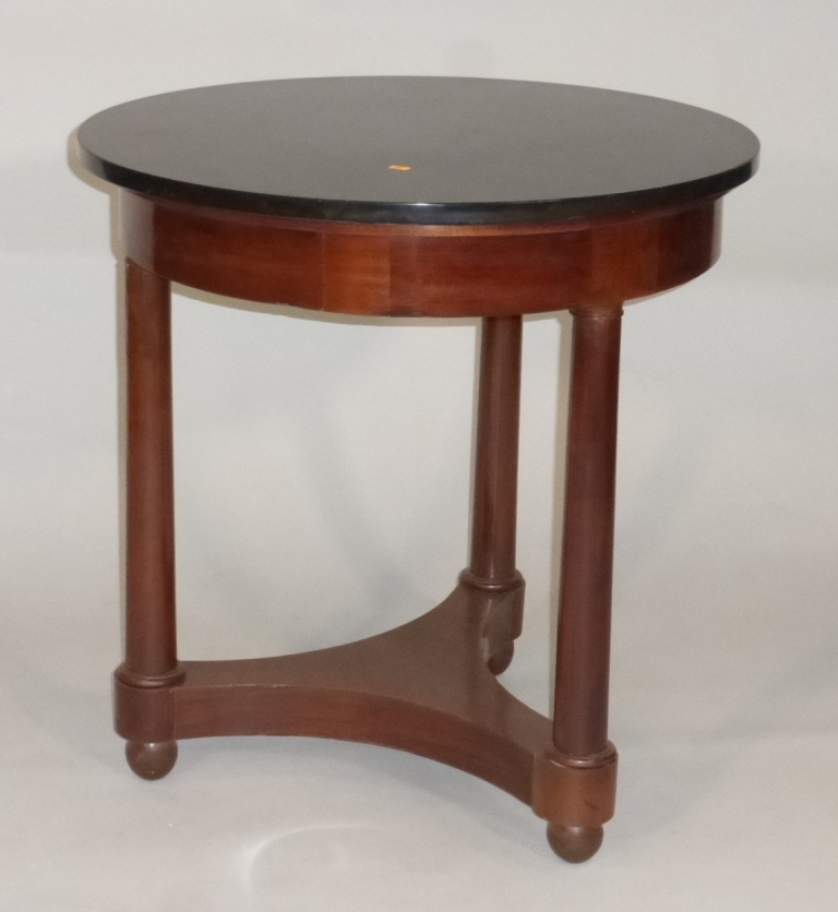Petite table guéridon en acajou. Piètement tripode réuni par une entretoise. Plateau rond en marbre noir. Epoque Empire H. 72 Diam. 70 cm