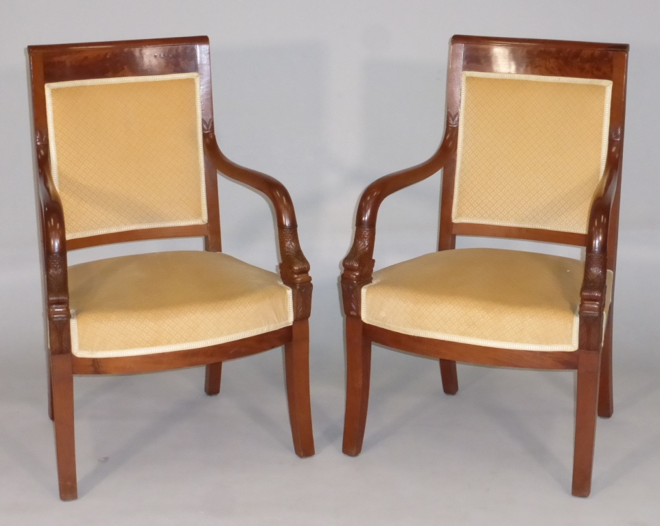 Paire de fauteuils en Paire de fauteuils en acajou. Accotoirs sculptés de dauphins. Repose sur des pieds sabres. Marqué: "C" sous une traverse. XIXe siècle. H. 92 L. 59 P. 51 cm