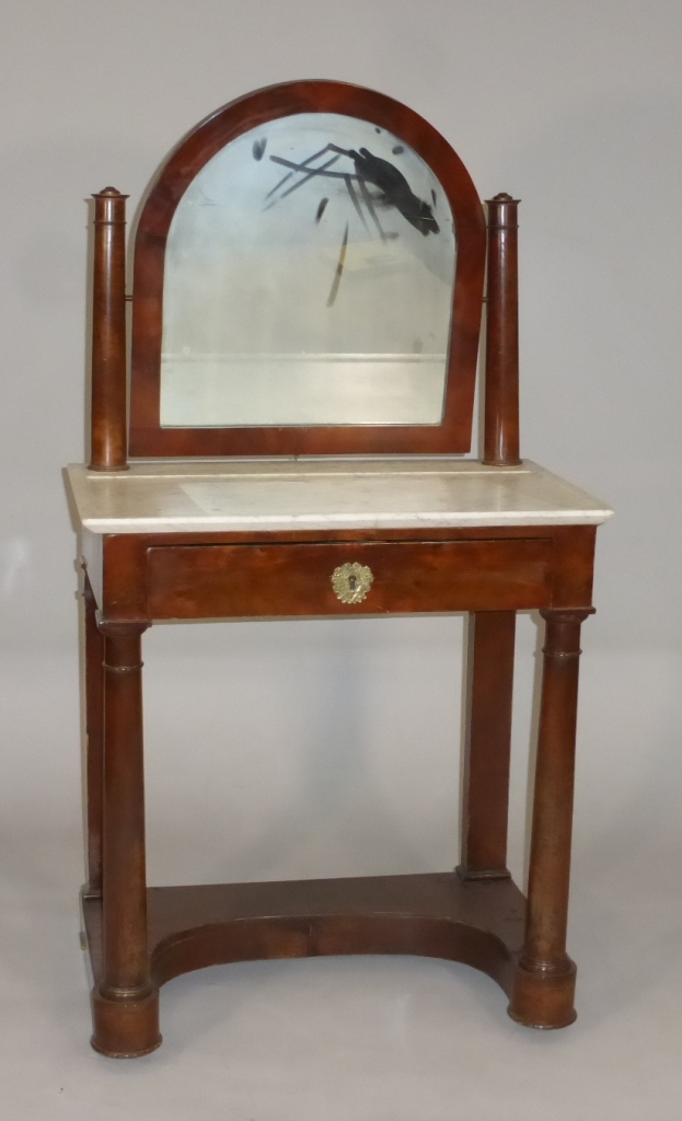 Coiffeuse en placage d'acajou à miroir en psyché. Plateau en marbre blanc veiné surmonté d'un miroir cintré épaulé par deux colonnes. Elle ouvre à un tiroir en ceinture. Epoque Empire