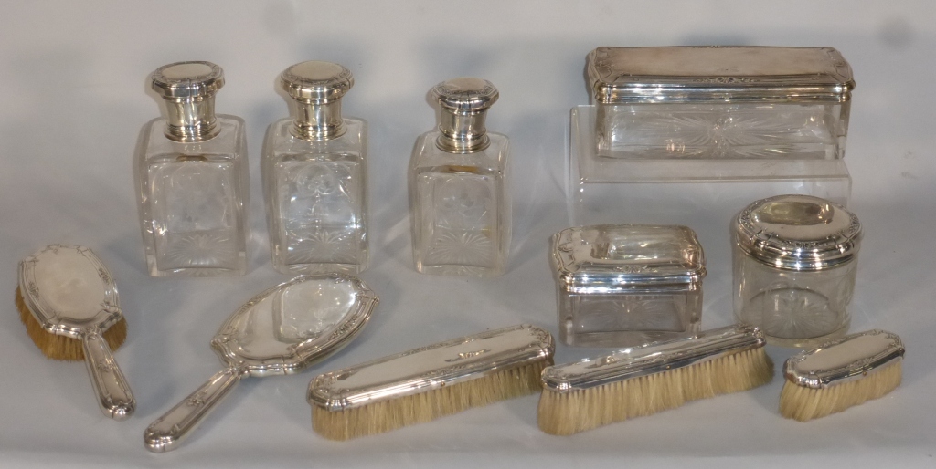 Service de toilette en argent et cristal taillé à décor de lambrequins.