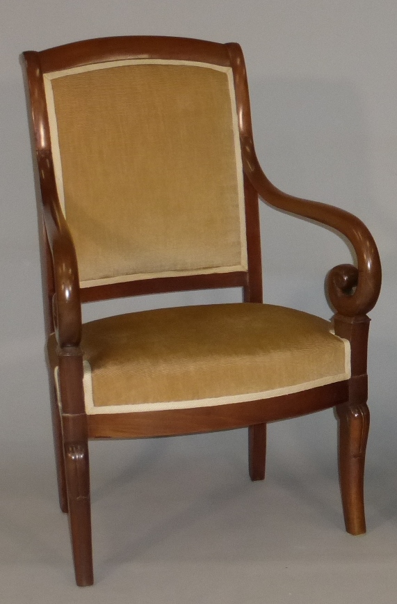 Fauteuil en acajou. Accotoirs en enroulement. Pieds jarret à l'avant. Epoque Charles X. H. 84 L. 60 P. 50 cm