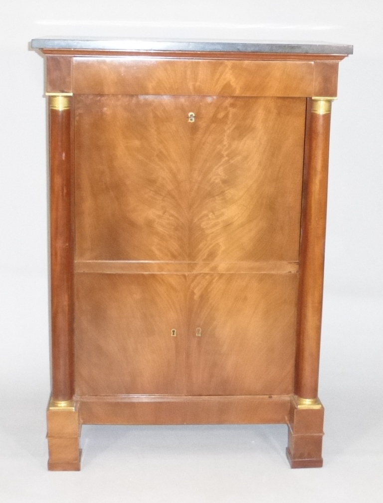 Secrétaire à abattant en placage acajou flammé ouvrant à un tiroir, un abattant et deux vantaux découvrant trois tiroirs. Montant à colonnes détachées. Dessus de marbre noir. Epoque Empire. H. 140 L. 96 P. 46 cm