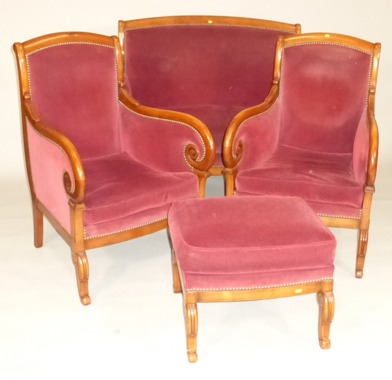 Salon en bois fruitier comprenant un canapé, une paire de bergères et un bout de pieds. Accotoirs à enroulement. Recouverts de velours bordeaux. Style Empire. Canapé: H. 94 L; 119 P. 55 cm Fauteuils: H. 94 cm
