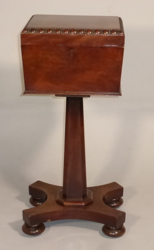 Travailleuse en placage d'acajou ouvrant à un coffret rectangulaire reposant sur un pied central. Epoque Louis Philippe. H. 80 L. 35 P. 30 cm