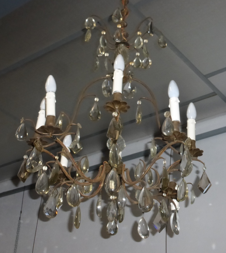 Lustre à huit bras de lumières en bronze et pampilles de cristal. H. 80 Diam. 65 cm