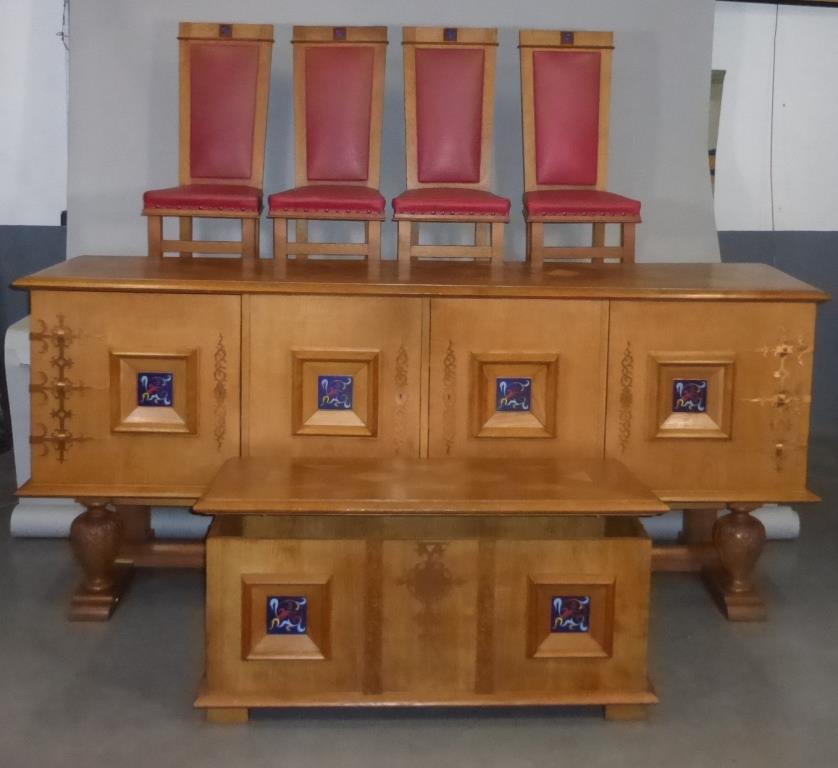 Travail FRANCAIS, vers 1950 - Mobilier de salle à manger en chêne et décor de plaques émaillées