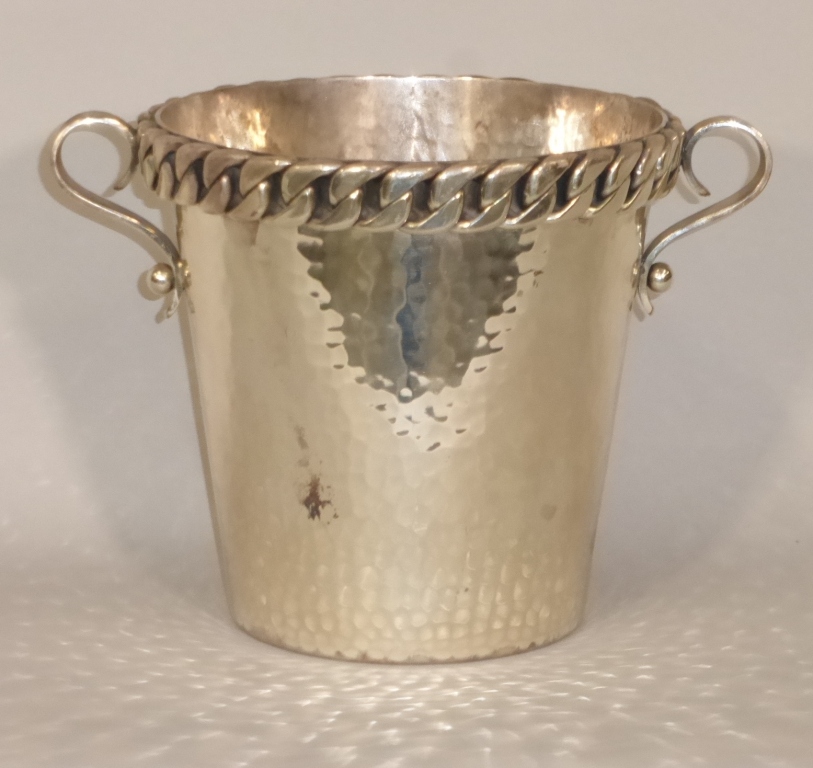 Jean DESPRES (1889-1980) - Seau à champagne en métal argenté martelé et décor de mailles gourmettes. Deux prises. Signé J. Després à la pointe sous la base. H. 19,5 cm