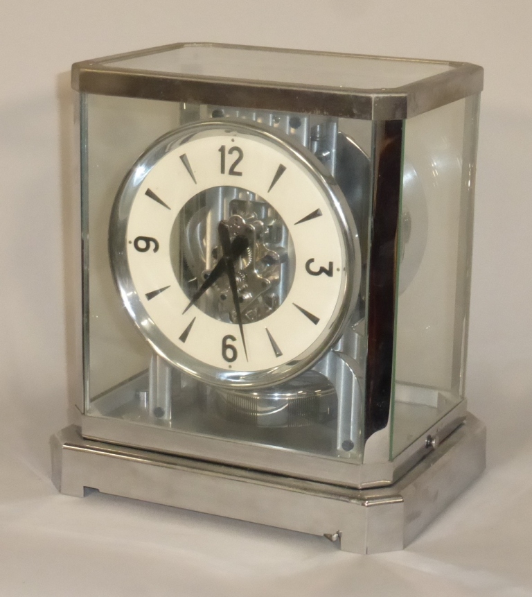JAEGER-LECOULTRE - Atmos V - Calibre 528-8 - Pendule en acier rhodié et cinq plaques de verre, Mouvement mécanique perpétuel, Cadran blanc et chiffre noirs. Modèle avec cage amovible. Marqué Atmos breveté Reuter - Jaeger Lecoultre Fabriqué en suisse