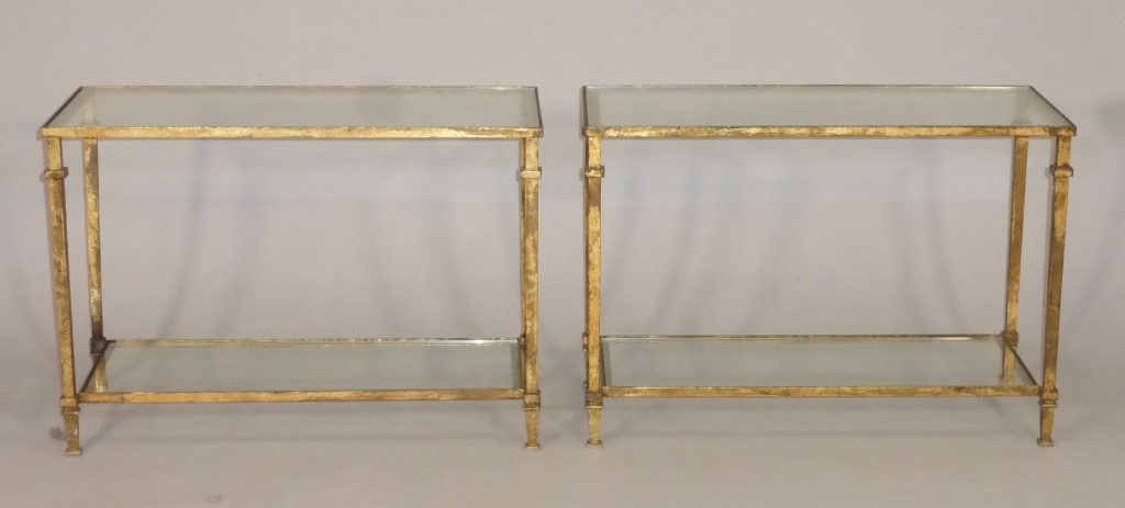Robert THIBIER (1926-2001) - Paire de tables de salon (bout de canapé) en fer battu et doré à deux plateaux. Elles reposent sur des pieds gaines. Vers 1950. H.50 L. 72 P. 32 cm
