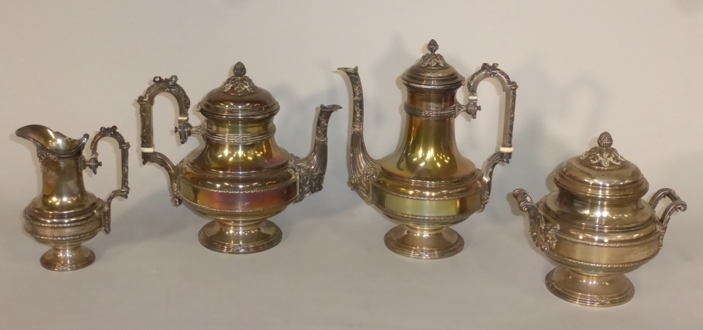 Service à thé et café en argent comprenant : cafetière, théière avec prises à bagues d'ivoire, sucrier et pot à lait. Décor de feuillages, rubans et guirlandes de fleurs. MO: D.R, Paris Poinçon Minerve 1er titre PB : 4 600 gr