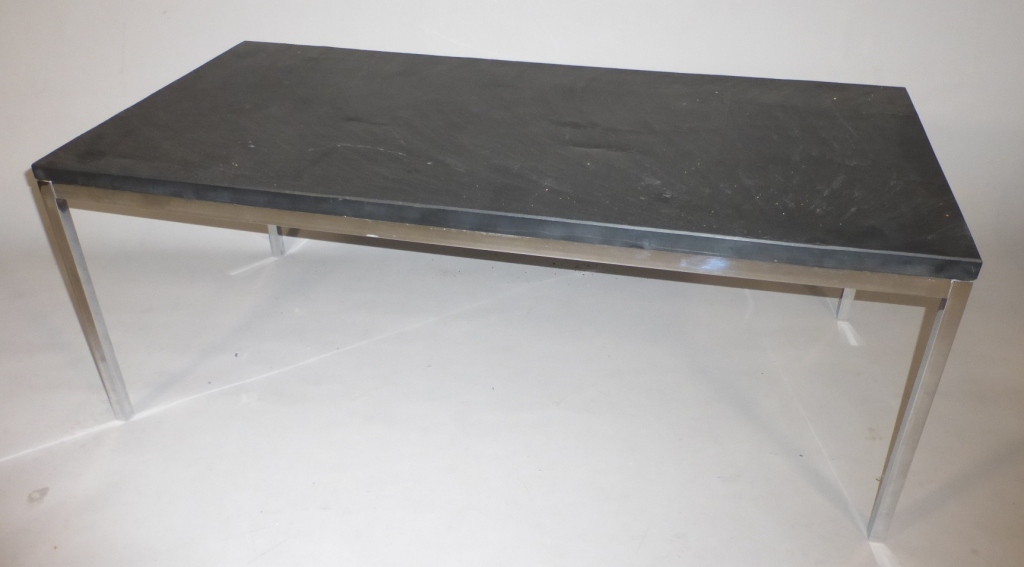 Florence KNOLL (1917-2019) Table de salon basse rectangulaire. Piétement en métal chromé et plateau en ardoise. H. 44 L. 114 P. 58 cm