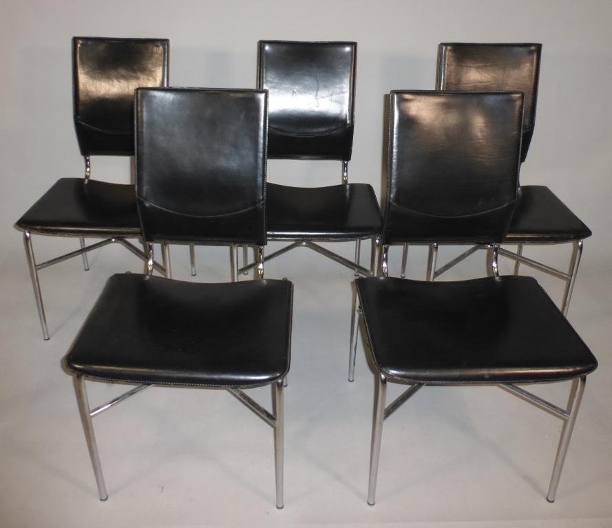 Matteo GRASSI (1927-2001) - Suite de cinq chaises à piètement en métal tubulaire chromé et assises et dossiers recouverts de cuir noir (griffures). H. 90,5 L. 49 P. 46 cm