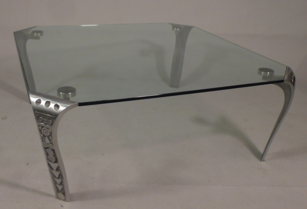 Arnoldo GAMBA - Table basse de salon. Plateau en verre, piètement en aluminium. Signée sur un pied. H. 39,5 L. 100 P. 100 cm