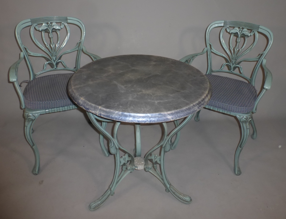 KETTAL BARCELONA - Deux fauteuils et un guéridon en métal émaillé vert à décor en coup de fouet de fleurs et feuillage. Plateau en rond en résine grise marbrée. Style Art Nouveau. Guéridon : H. 73 D. 70 cm Fauteuils : H. 86,5 P. 40 L. 45 cm