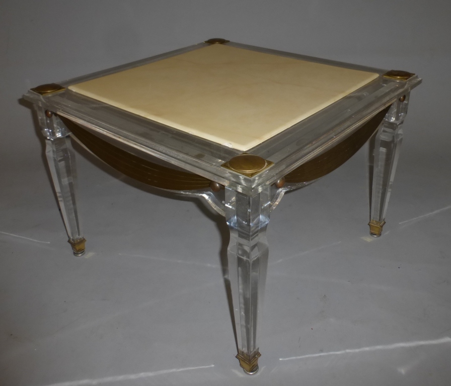 Table basse carrée en plexiglas et laiton à décor de drapés. Plateau façon marbre crème en résine. Repose sur des pieds gaines. (accidents aux angles - rayures plateau et plexiglas) H. 45 L. 62 P. 62 cm